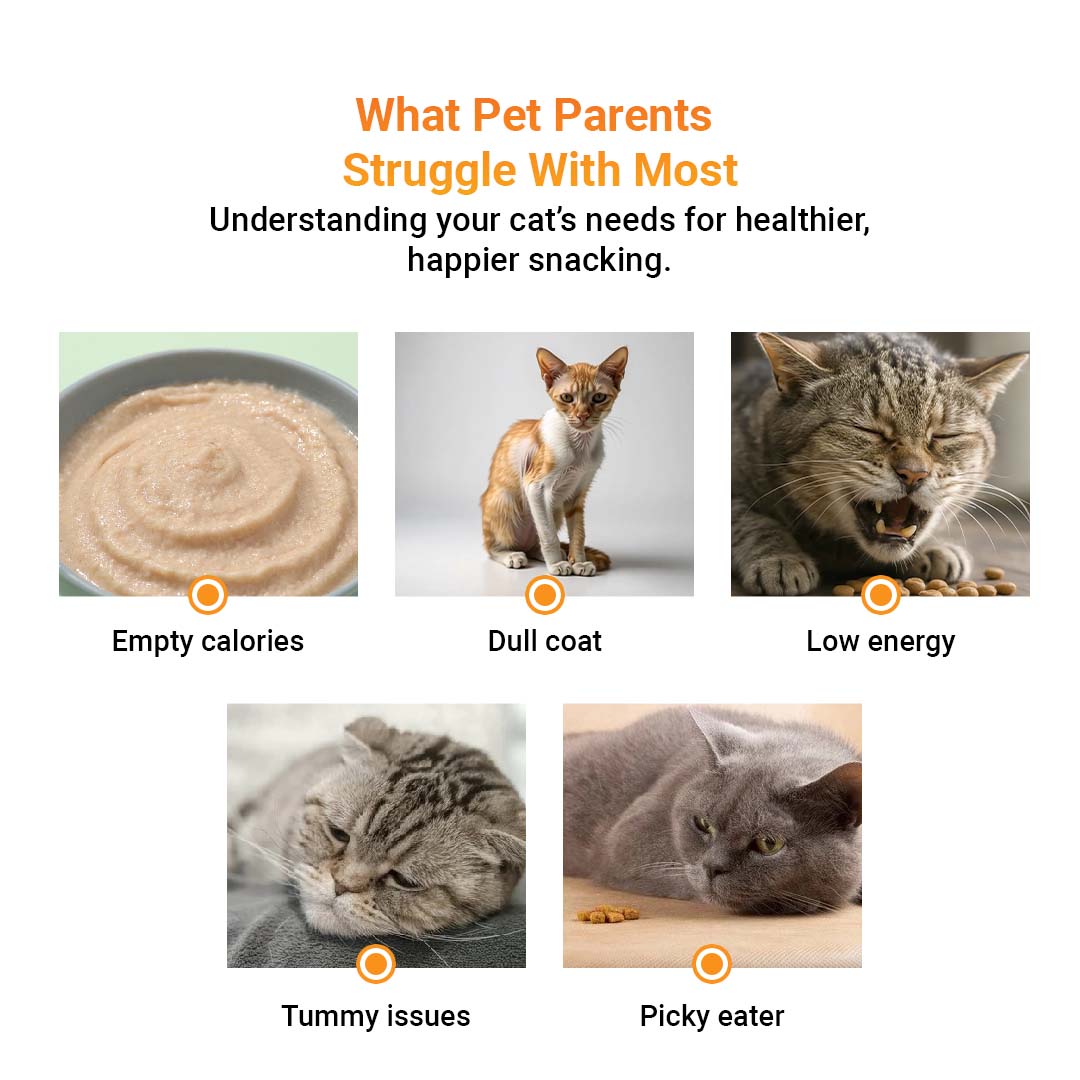 ❌ Dull coat & dry skin / Bulu kusam & kulit kering ❌ Frequent hairball vomiting / Sering muntah hairball ❌ Poor appetite or picky eating / Hilang selera atau cerewet makan ❌ Shedding or rough fur texture / Bulu mudah gugur atau kasar ❌ Need for omega-rich daily nutrition / Perlukan nutrisi harian kaya Omega