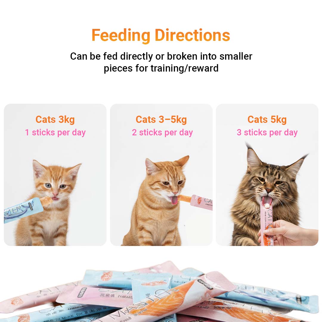 2️⃣ Serve 1–2 sticks daily per cat (based on size & activity). Disyorkan 1–2 batang sehari bergantung pada saiz & tahap aktiviti kucing.
