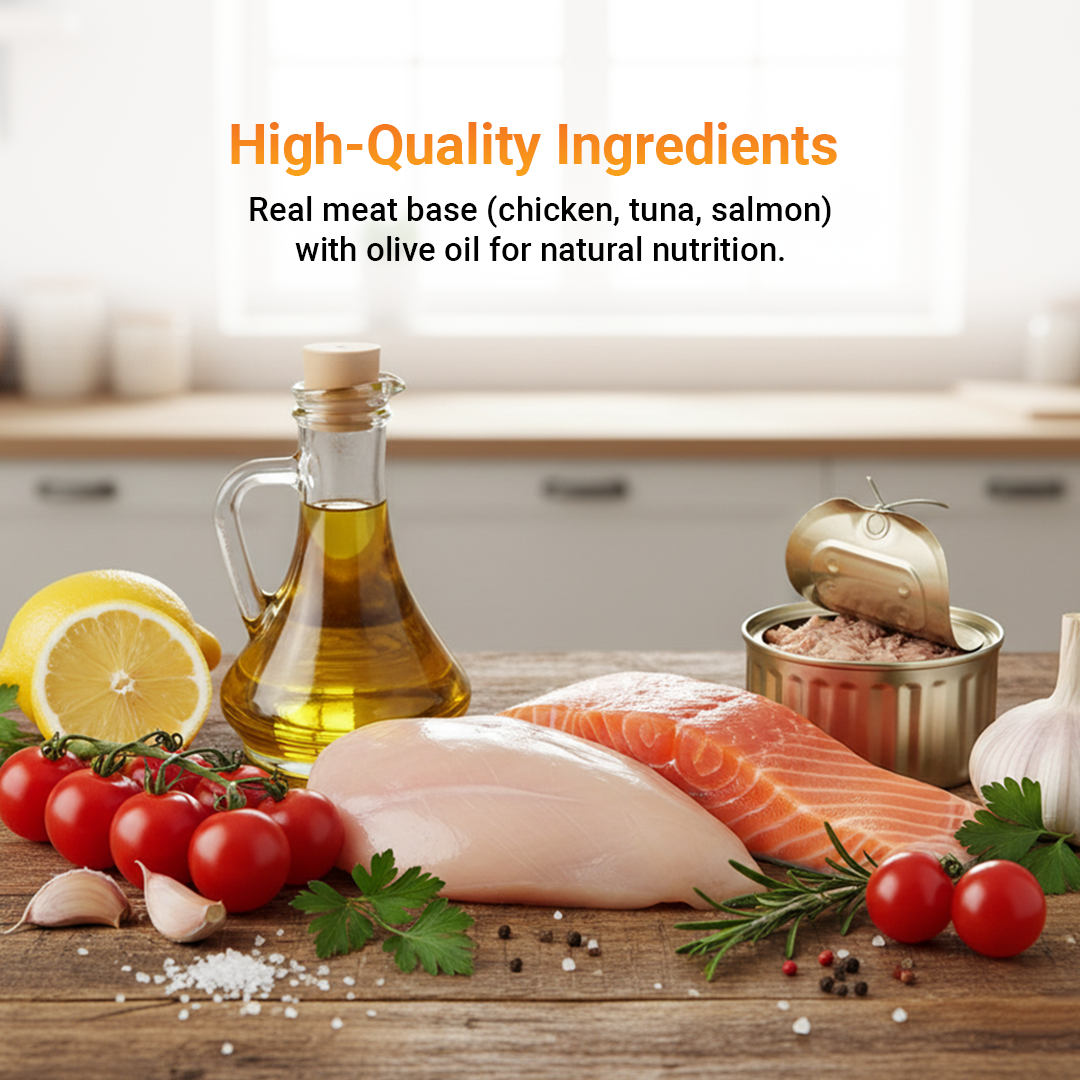 4️⃣ Tasty & Easy to Feed / Sedap & Mudah Diberi Smooth texture cats love — serve directly or as a meal topper. Tekstur lembut disukai kucing — boleh diberi terus atau dicampur dalam makanan.