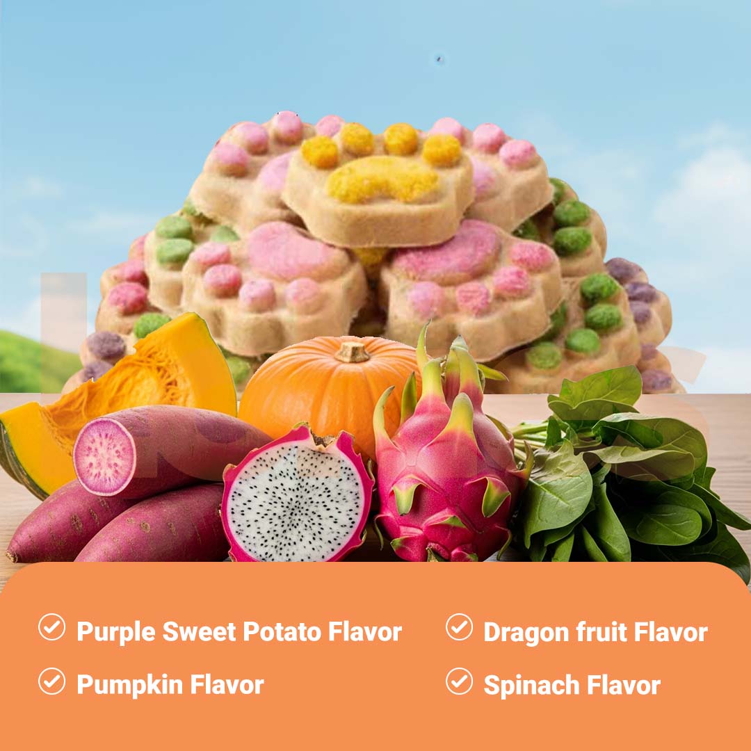 Comes in 4 natural flavours — Dragon Fruit, Spinach, Sweet Potato, and Pumpkin, giving your pets a healthy and colourful variety to enjoy every day! Datang dalam 4 perisa semula jadi — Buah Naga, Bayam, Keledek & Labu, penuh warna & khasiat yang disukai haiwan peliharaan anda!