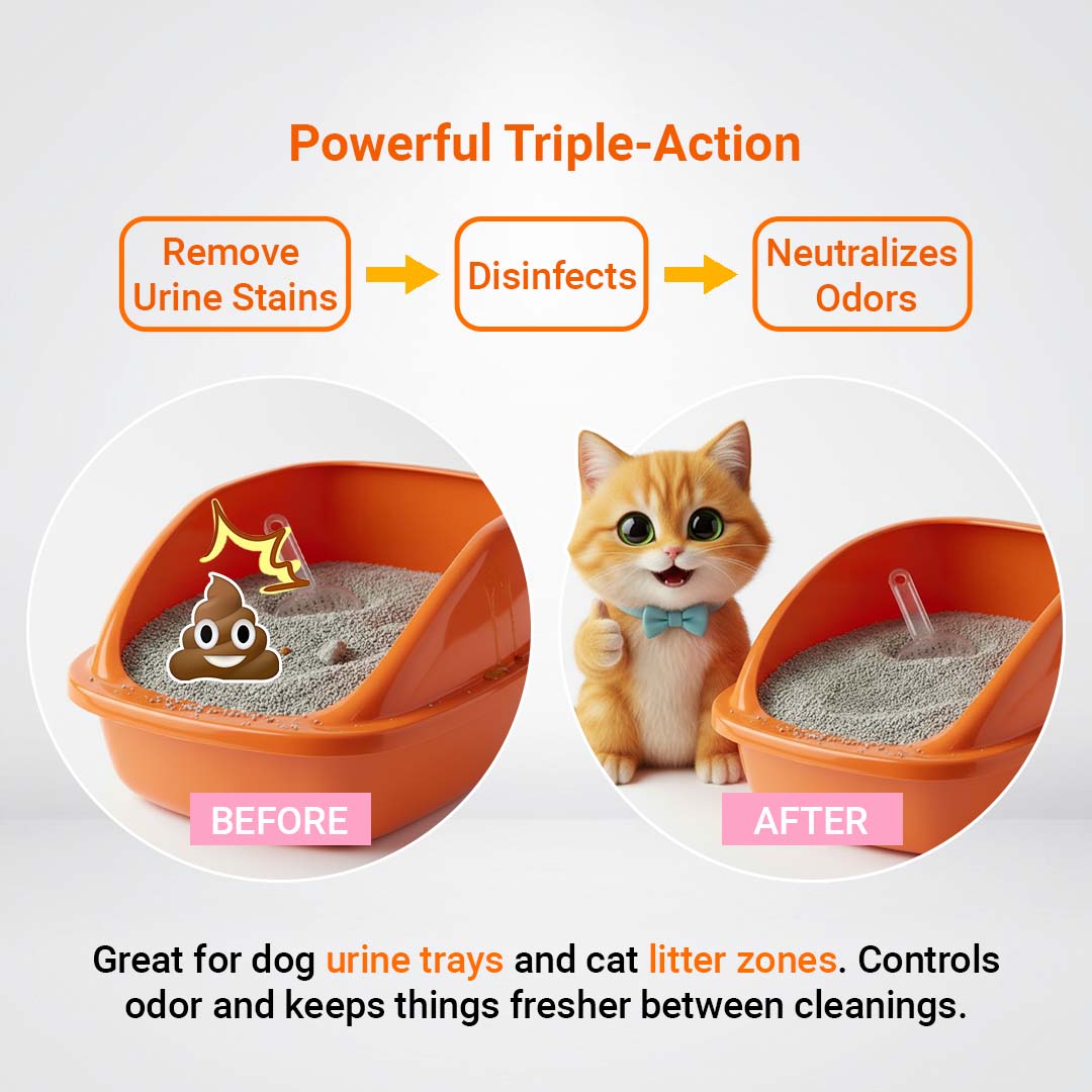 ❌ Stubborn urine stains on floor or carpet / Kesan air kencing degil di lantai atau permaidani ❌ Lingering pet odours that won’t go away / Bau haiwan yang kekal lama ❌ Germs & bacteria from pet messes / Kuman dan bakteria akibat najis haiwan ❌ Dirty dog urine boards or litter box areas / Kawasan tandas haiwan yang berbau ❌ Need for safe, chemical-free cleaning / Perlukan pembersih yang selamat tanpa bahan kimia keras