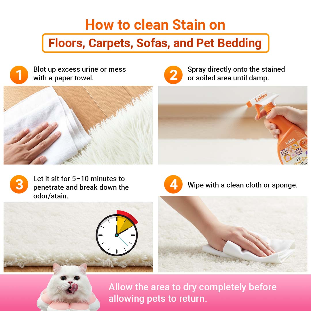For Floors, Carpets, Sofas & Pet Bedding / Untuk Lantai, Permaidani, Sofa & Tilam Haiwan: 1️⃣ Blot excess urine or mess. / Serap lebihan air kencing atau kotoran. 2️⃣ Spray directly until damp. / Sembur terus sehingga lembap. 3️⃣ Leave for 5–10 mins. / Biarkan selama 5–10 minit. 4️⃣ Wipe with clean cloth or sponge. / Lap dengan kain bersih. 5️⃣ Let area dry completely. / Biarkan kering sepenuhnya sebelum digunakan semula.