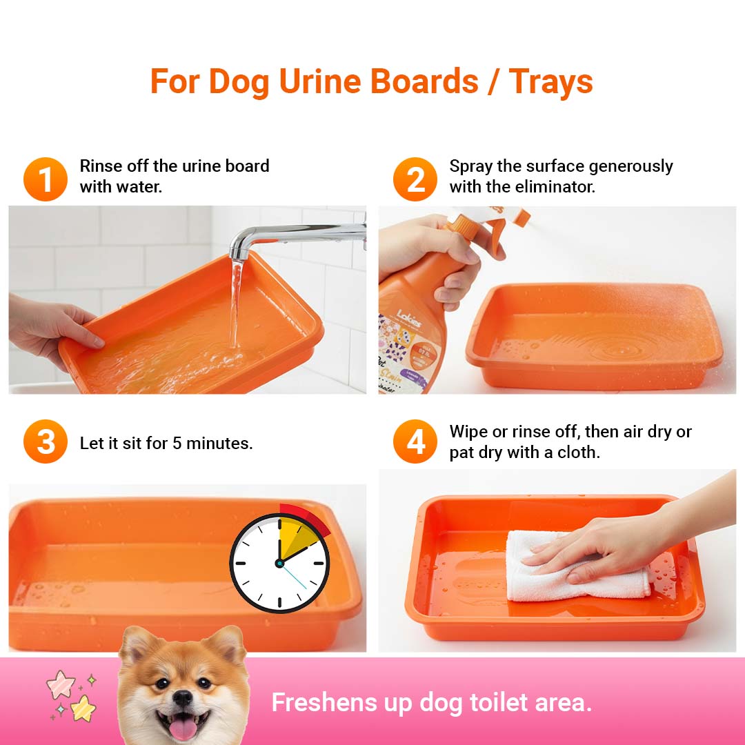 For Dog Urine Boards / Untuk Papan Kencing Anjing: 1️⃣ Rinse with water. / Bilas dengan air. 2️⃣ Spray surface generously. / Sembur dengan banyak pada permukaan. 3️⃣ Wait 5 minutes, then wipe or rinse. / Tunggu 5 minit, kemudian lap atau bilas.