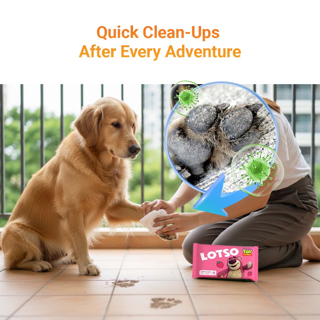 ❌ Dirty paws after walks / Tapak kaki kotor selepas berjalan ❌ Mud or food stains on fur / Kotoran lumpur atau makanan pada bulu ❌ Odor buildup from outdoor play / Bau badan selepas bermain di luar ❌ Need for travel-sized hygiene / Perlukan penjagaan mudah dibawa ❌ Sensitive skin requiring gentle wipes / Kulit sensitif perlukan tisu lembut