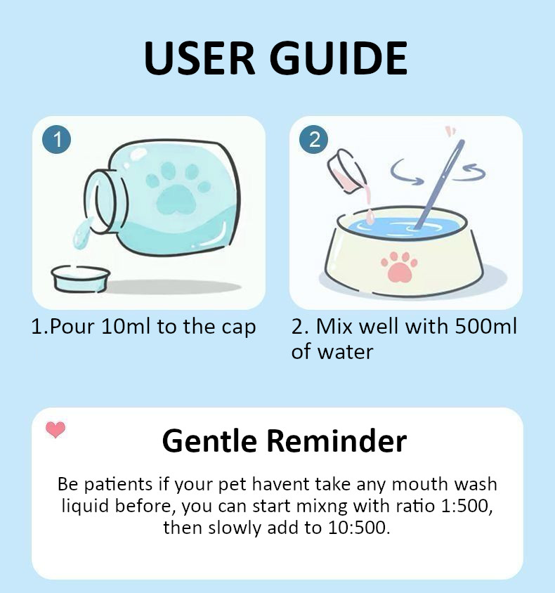 Hanya campurkan ke dalam air minuman atau guna terus untuk rutin penjagaan gigi tanpa stres, sesuai untuk haiwan yang tidak suka gosok gigi.